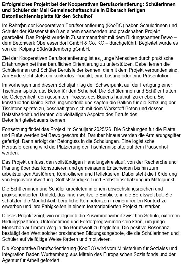 Schülerinnen und Schüler der neunten Klassen konnten im Rahmen der kooperativen Berufsorientierung (KooBo) mehrere Firmen besichtigen: im Februar waren sie bei Grüner & Mühlschlegel, um die Arbeitsbereiche Hoch-, Tief- und Gartenbau kennenzulernen. Im März gab es interessante Einblicke in die Holzverarbeitung bei best wood SCHNEIDER und im Mai bei Fischer in die Metallverarbeitung. In allen Firmen wurden mögliche Ausbildungsberufe vorgestellt und für Praktika geworben.